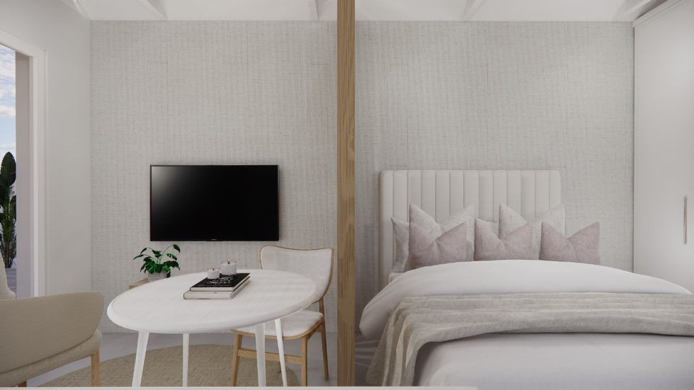 This thoughtfully designed studio bedroom creates a calm and stylish haven for a young student, seamlessly integrating a kitchenette, lounge, dining, and sleeping area within one smart layout. A soft palette of white, natural wood, and blush pink flows throughout the space, warmed by brass hardware and enhanced by an abundance of natural light.